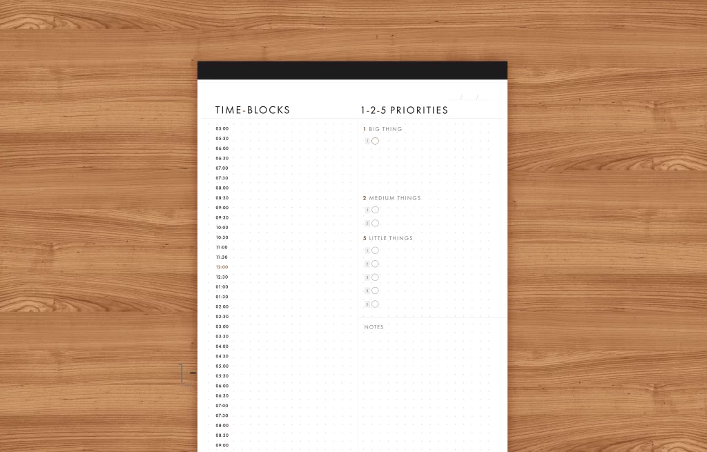 The 1-2-5 Time-Blocking Pad is the daily planning tool you’ve been waiting for. Beautiful layout. Space for your most important tasks. Undated. Perforated. With time-blocks in 30-minute increments from 5:00am – 9:00pm. Chef’s kiss.